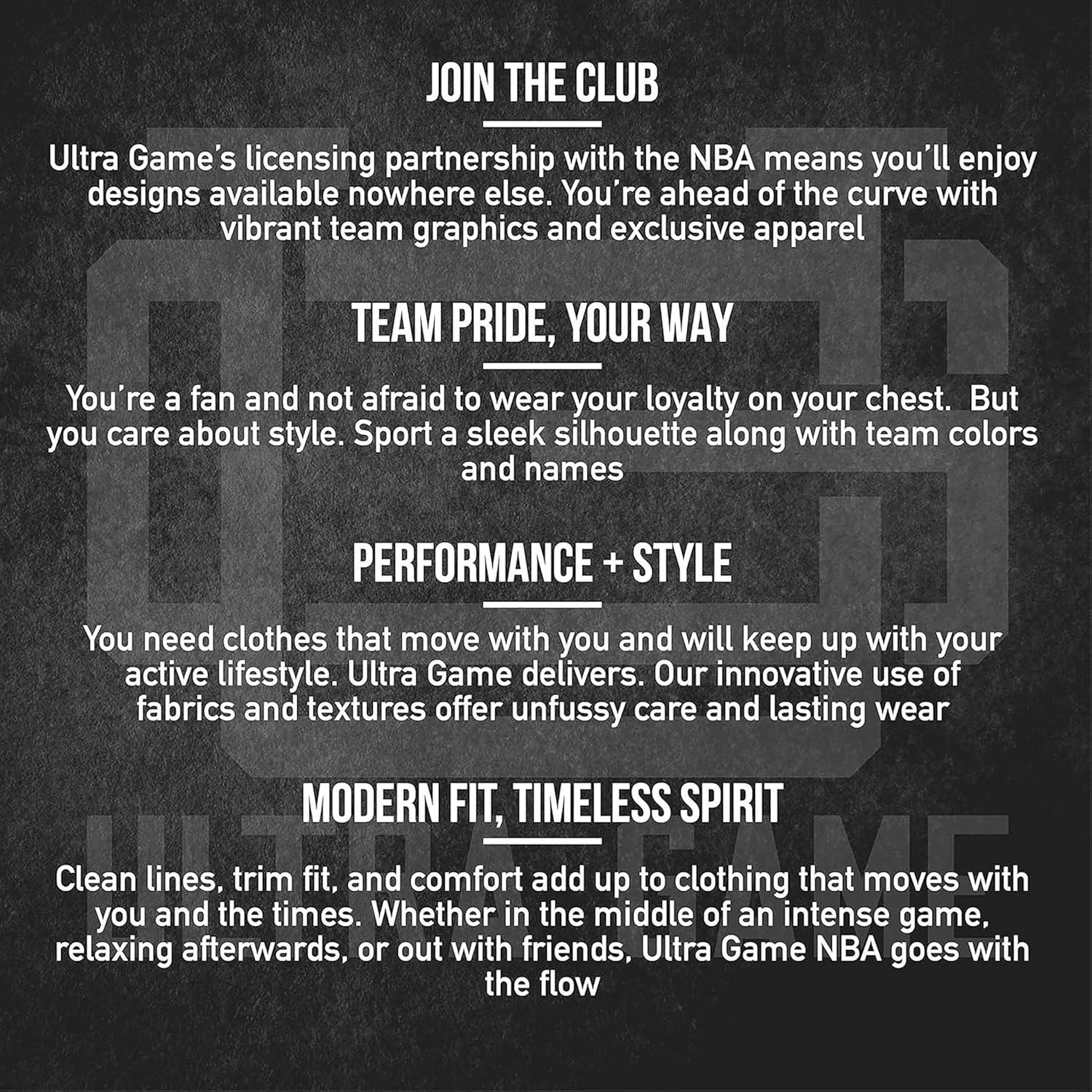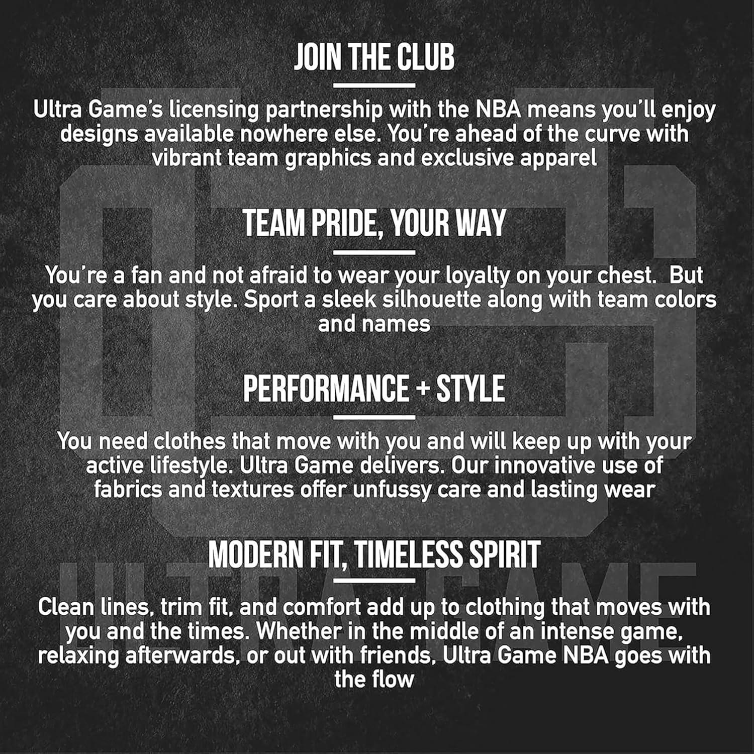 ULTRA GAME NBA APPAREL: Officially Licensed by The NBA (National Basketball Association); Ultra Game NBA features innovative designs with forward thinking graphics and textures