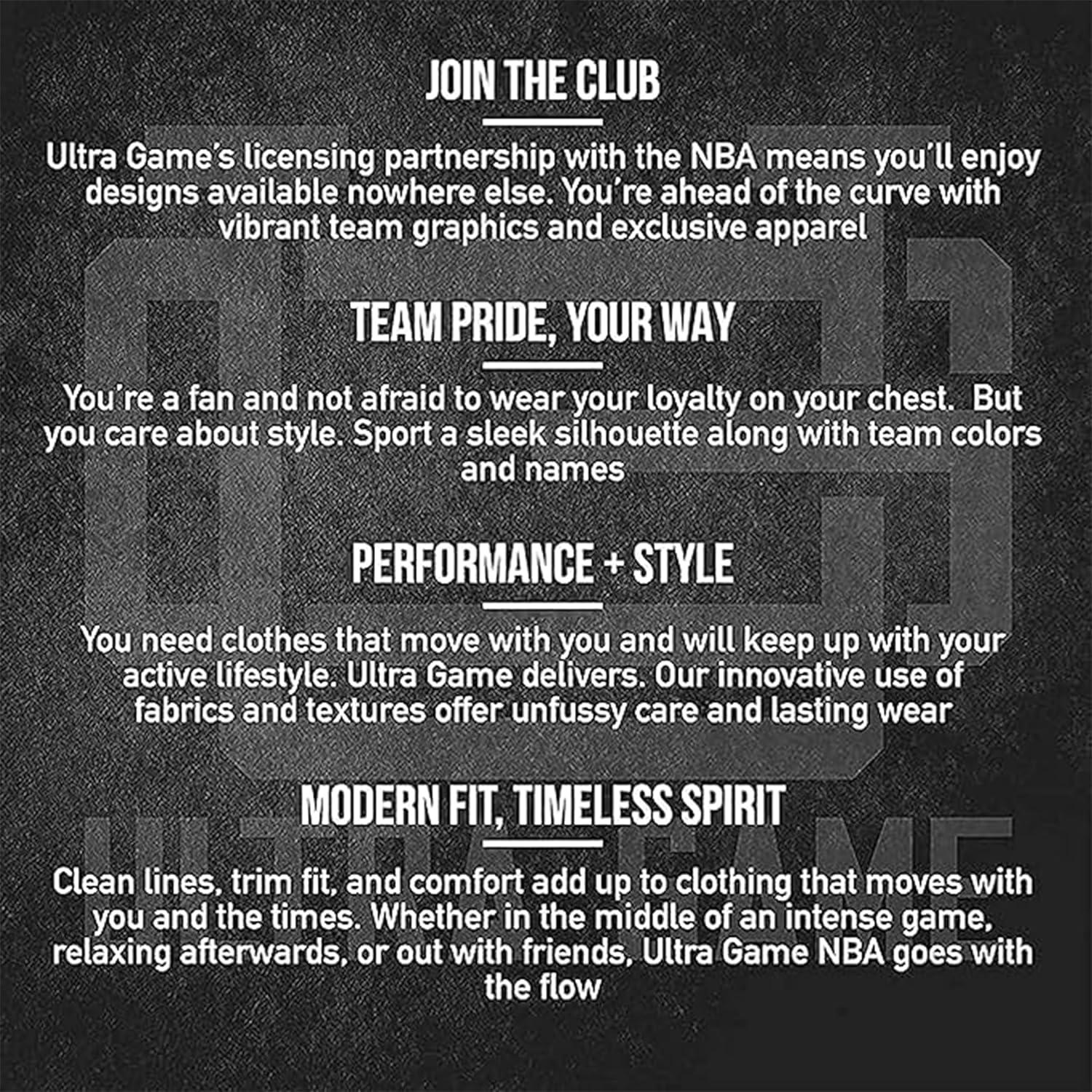 Ultra Game partners with the major sports leagues and franchises to bring you officially licensed gear at down-to-earth prices. If you like to wear your passion in public, Ultra Game's got you covered. Whether it's streetwear, loungewear, or true workout gear, Ultra Game is your number one source for highly fashionable team apparel. Why buy Ultra Game brand products? 100% Authentic – Ultra Game manufactures officially licensed apparel for the NBA and NFL. Best In Class Apparel – We focus on manufacturing the highest quality apparel at affordable prices. Highly Fashionable – We are constantly updating our styles with the latest fashion trends. Satisfaction Guaranteed – We will work with you to resolve all issues until you are completely satisfied.
